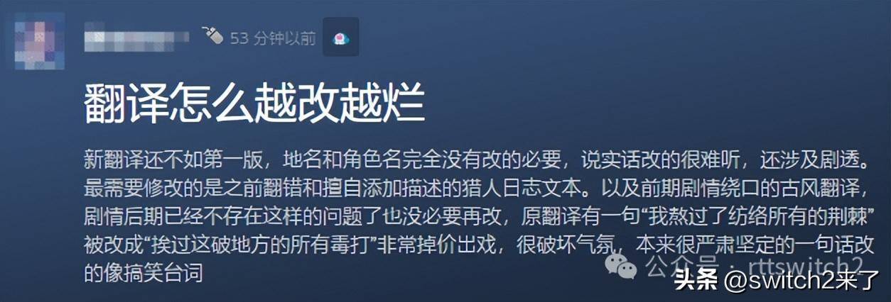 新基础版本简体中文翻译上线后,引发众多国内玩家吐槽,认为这次的翻译反倒比初始翻译更加糟糕,一些地名看上去更加奇怪,例如“苔藓之母”变成了“苔藓母主”、“次席戍卫”变成了“二号戍卫”等。有玩家吐槽道:“原翻译有一句‘我熬过了纺络所有的荆棘’被改成‘挨过这破地方的所有毒打’非常掉价出戏,很破坏气氛,本来很严肃坚定的一句话改的像搞笑台词。”