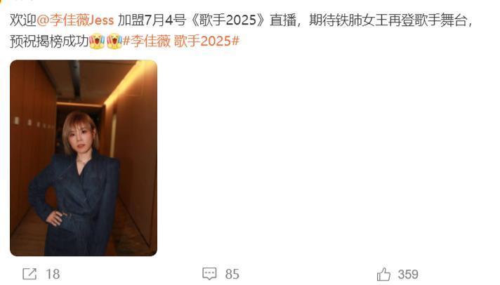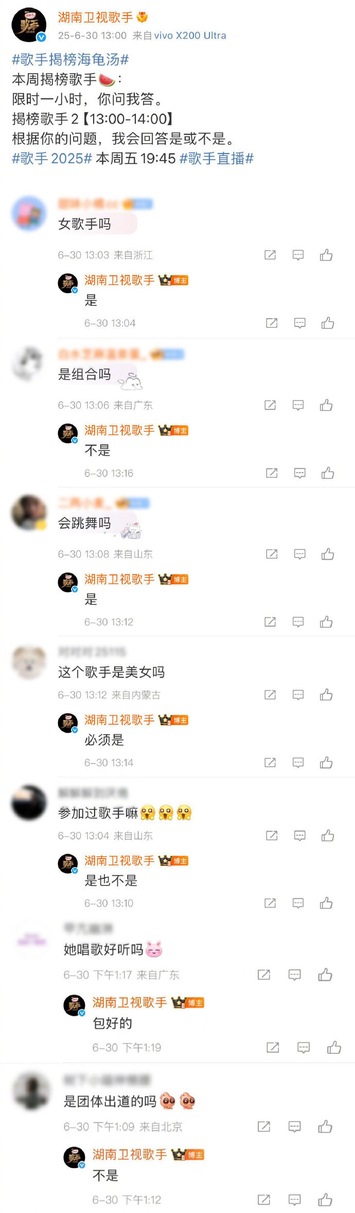 6月30日,《歌手2025》官方发出2条消息,表示网友们可以随意提问关于选手的相关消息,然后官方进行回答:是或不是,从官方的回复上看,第一位揭榜歌手是一位女歌手,是凭借歌唱比赛出道的,没有参加过《浪姐》,直接排除网传的何洁和王蓉,曾经拿过比赛冠军。
